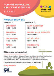 - Okolo Třeboně a SAIJiž druhým rokem pokračuje partnerství mezi festivalem Okolo Třeboně a SAI, kdy v rámci Rodinného odpoledne, SAI připravila sobotní a nedělní hudební stage 13-17 hod. na pódiu budou mít šanci prezentovat své umění finalisté soutěže Šance Muzikus.